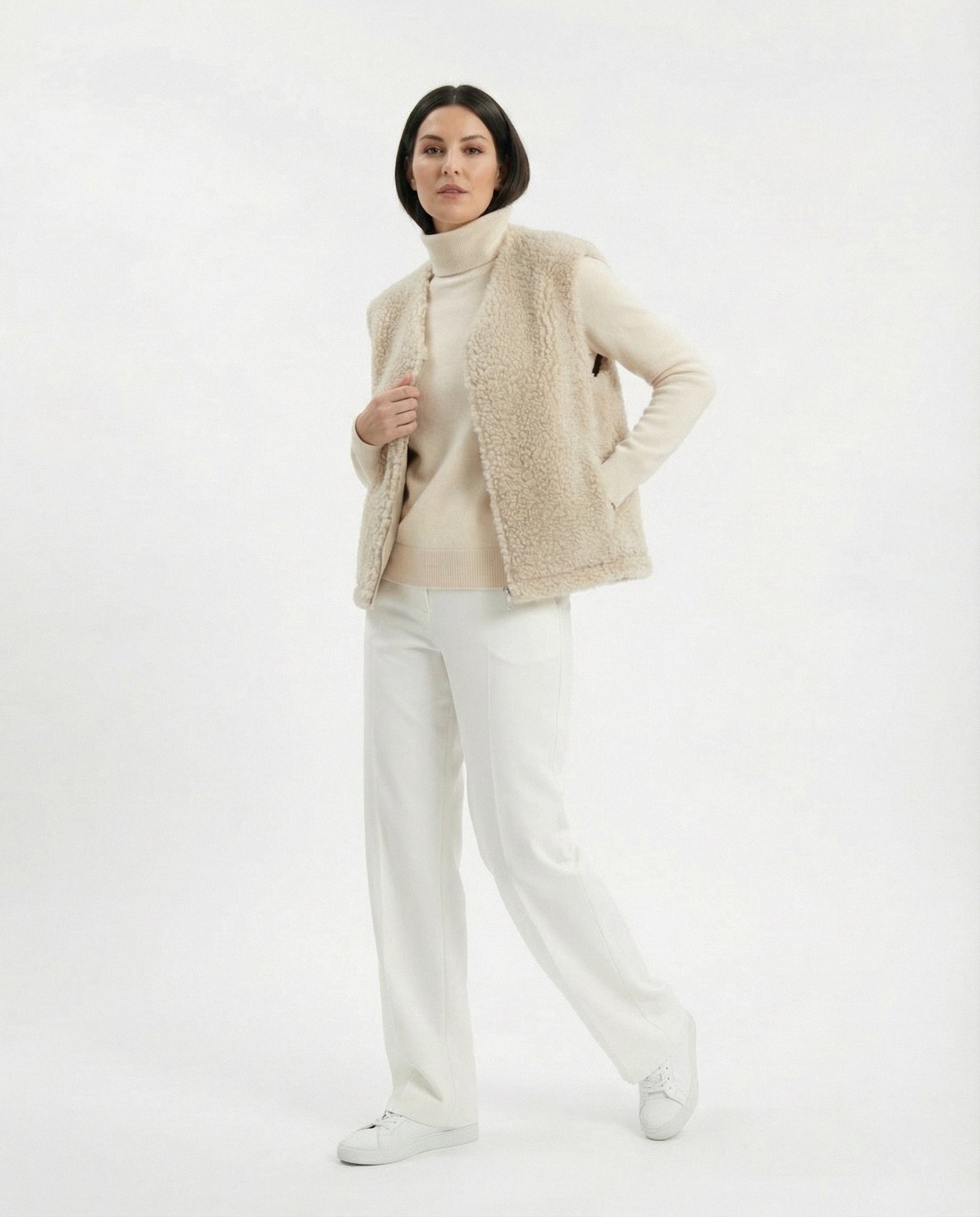 Die Nora Weste besteht aus 100 % Wolle mit dichter Teddy-Struktur. Das ungefütterte Design mit sichtbarem Innenfutter sorgt für natürliche Temperaturregulierung. Sie verfügt über zwei Innentaschen aus Baumwolle. Durch ihren geraden, leicht lockeren Schnitt eignet sie sich ideal zum Tragen über einem Pullover oder Langarmshirt.