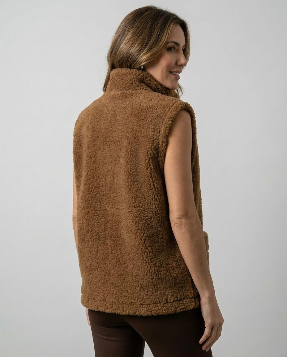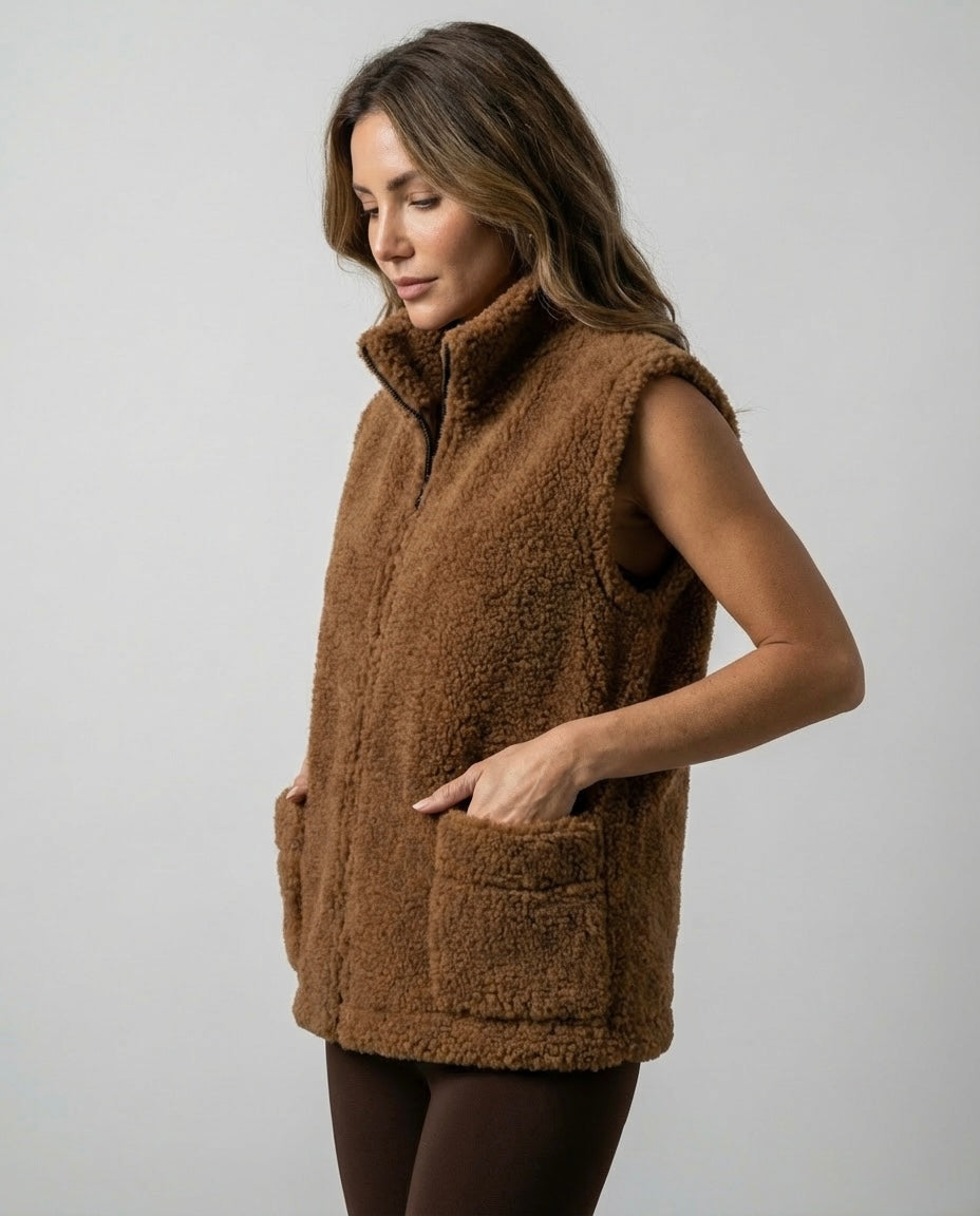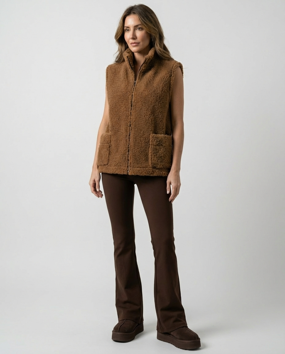 Kamizelka teddy wykonana z naturalnej wełny owczej w odcieniu głębokiego brązu.