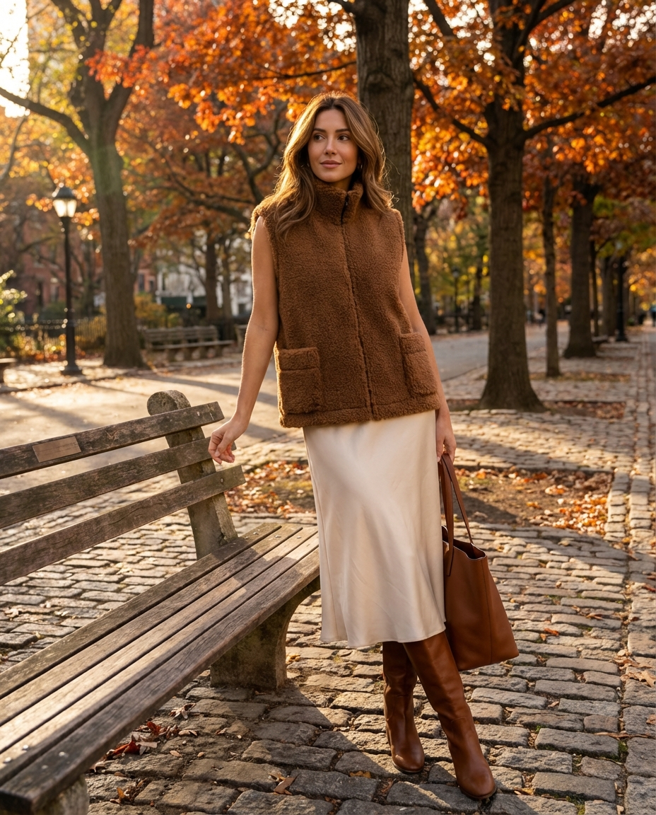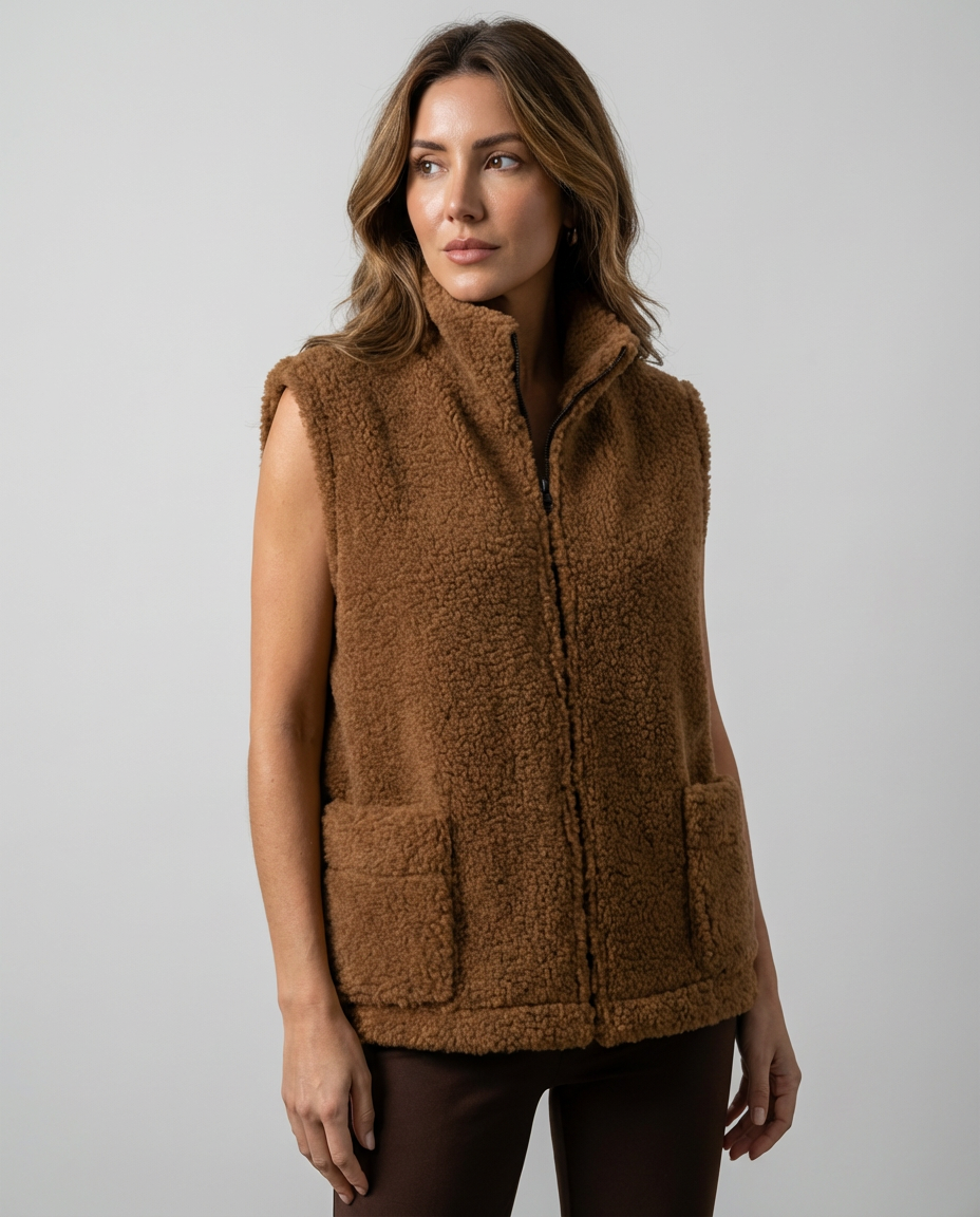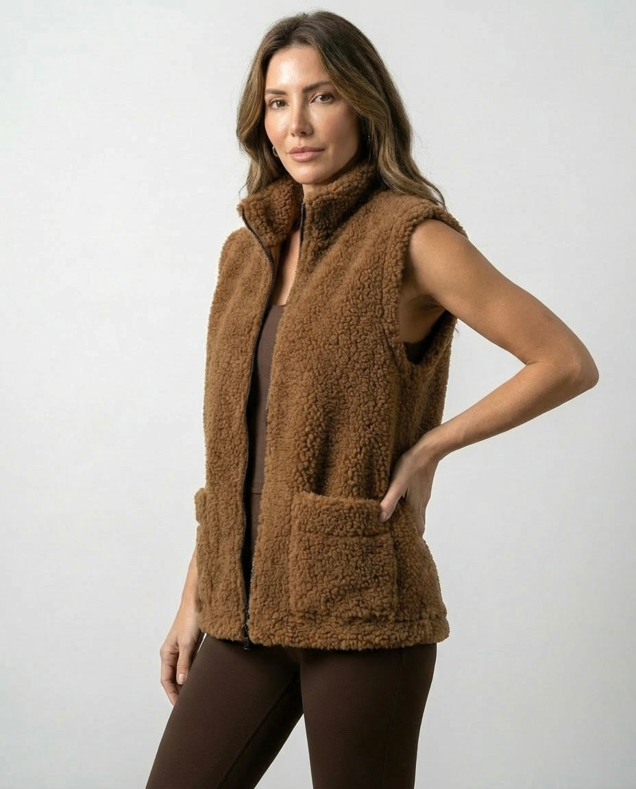 Kamizelka teddy wykonana z naturalnej wełny owczej w odcieniu głębokiego brązu.