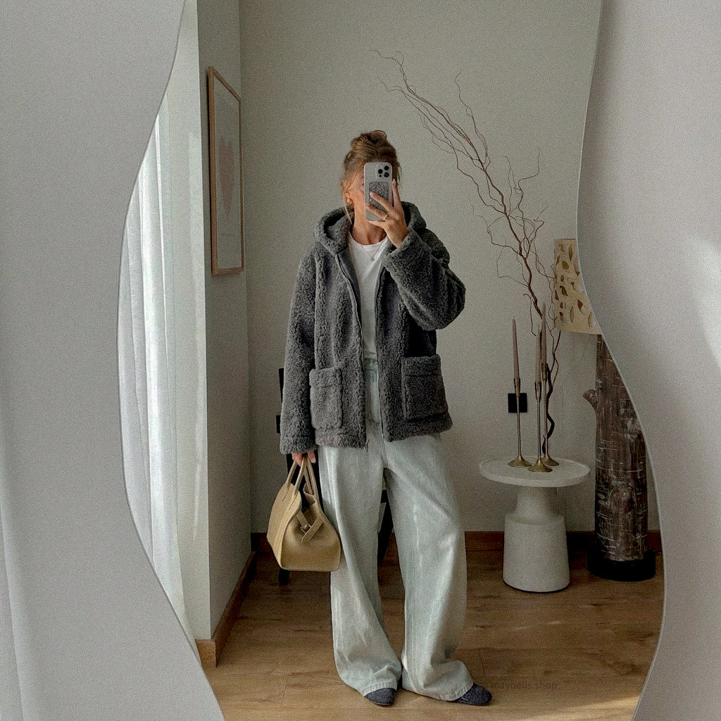 Ciepła i miękka kurtka teddy wykonana z naturalnej wełny owczej. Idealna na chłodne dni – otula, zapewniając komfort i styl.